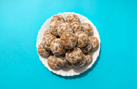 Famous russian gingerbread on white plate on blue background. Heap of round russian glazed gingerbread. Honey cakes. Top view
