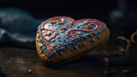 Heart shaped cookie with colorful sprinkles on dark background, closeup