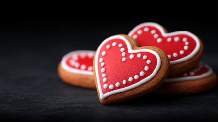 A close-up view of heart-shaped cookies decorated with white icing, perfect for romantic occasions or special celebrations against a dark backdrop.