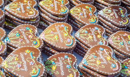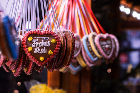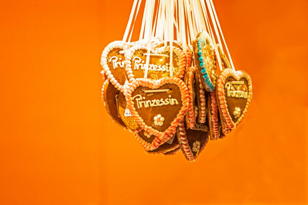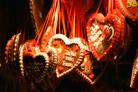 Ornate heart shaped artisanal handmade gingerbread Lebkuchen cookies on display at the charming traditional Christmas Market in Zurich, Switzerland