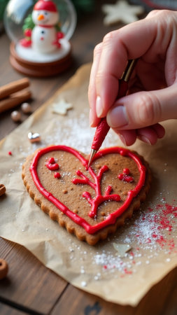 Holiday baking: decorating heart shaped gingerbread cookies for a festive winter treat.
