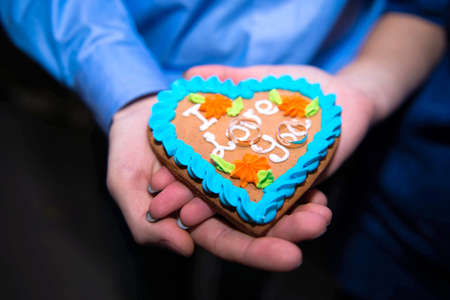 Heart shaped cookie with inscription. Biscuit of brown color. Convey message through a gift. Confession in love.