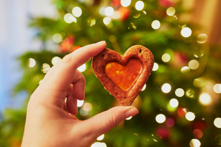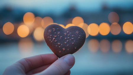 A person holds a heart-shaped cookie against a backdrop of soft, glowing lights, creating a warm and romantic atmosphere perfect for celebrations.