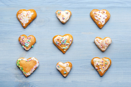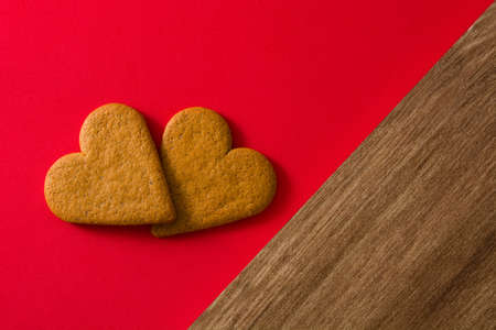 Gingerbread hearts stacked side by side, view from the top, can be used as a greeting card for Valentine's Day.