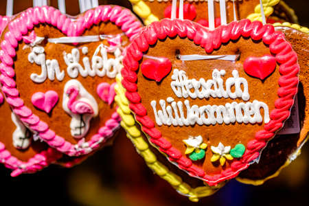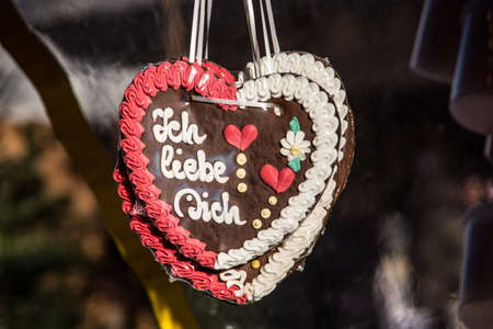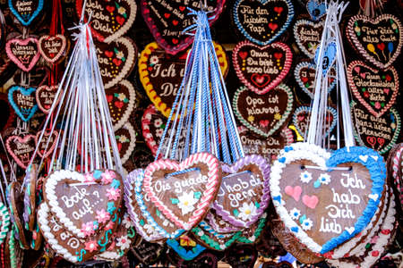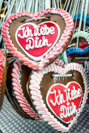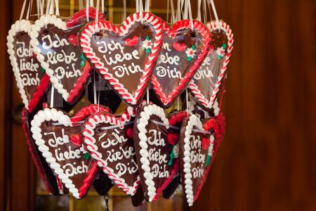Gingerbread Hearts at German Christmas Market. Nuremberg, Munich, Fulda, Berlin, Hamburg xmas market in Germany. In German language I love you.