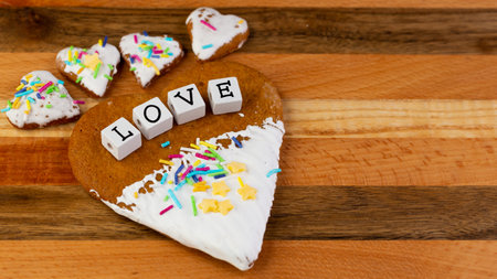 A composition of glazed gingerbreads in the shape of hearts and the word Love arranged on a wooden board