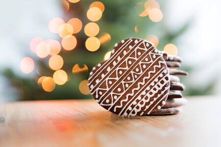 gingerbread cookies on the table, christmas lights bokeh