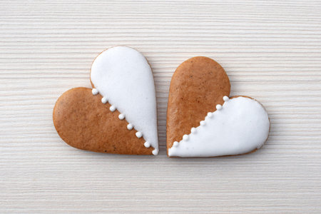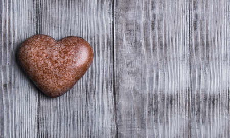 A heart-shaped gingerbread cookie, a sweet and artful baked good, displayed on a wooden table. This fashionable food ingredient is a symbol of love and sweetness