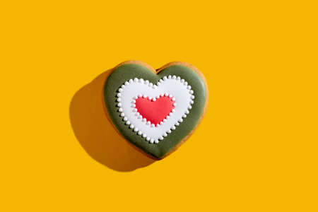 Holiday dessert. Valentine Day. Creative bakery food. Romantic greeting card. Green white red homemade gingerbread heart cookie ornament isolated on bright yellow empty space background.