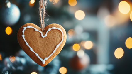 Handcrafted heart-shaped gingerbread cookies with icing hanging as Christmas decor. Concept of holiday spirit and tradition.