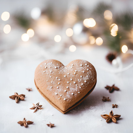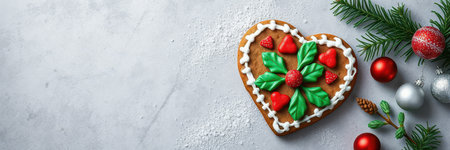 Beautifully decorated heart-shaped gingerbread cookie with festive elements on a marble surface