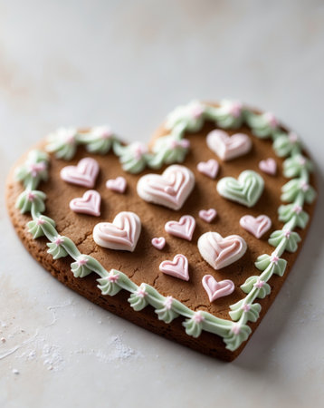 AI Generated. A beautifully decorated Gingerbread Heart featuring delightful icing and charming hearts