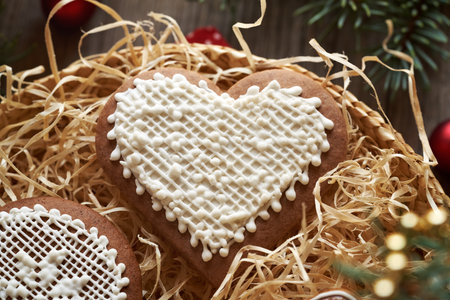 Closeup of a heart shaped homemade gingerbread Christmas cookies decorated with white icing in a wicker basket with spruce tree branches