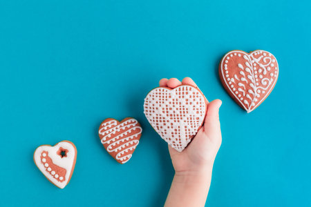 Some gingerbread cookies in shape of heart on blue background. Childrens hand hold one gingerbread