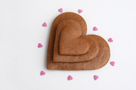 Undecorated heart-shaped gingerbread cookies in three sizes with small sugar hearts on a white background, copy space for text