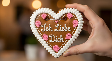 A hand holds a heart-shaped gingerbread cookie (Lebkuchenherz) decorated with pink and white frosting. The cookie has the German phrase 'Ich Liebe Dich' (I Love You) written on it, a traditional gift from German fairs like Oktoberfest.