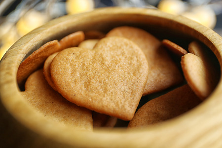 Heart shaped biscuits in wooden bowl, closeup