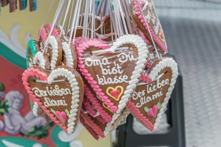 Gingerbread hearts at a folk festival with German words - Grandma you are great, Germany
