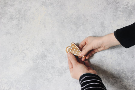 Child and woman hands holding ginger bread heart cookie with white icing. Valentine or Mothers day holiday day composition. Love concept. Grunge background with negative space, flat lay, top view.