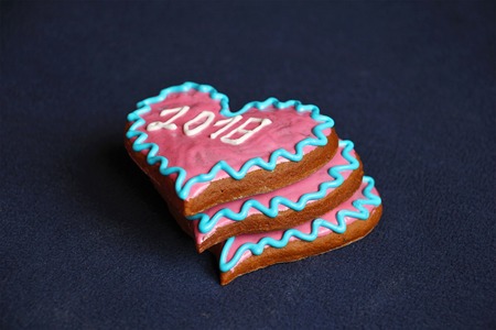 three gingerbread cookies in form of heart with the inscription 2018, traditional Russia North (Arkhangelsk) christmas bakery