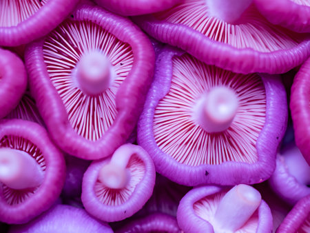 Striking Purple macro closeup mushrooms. Botanical forest. Generate Ai