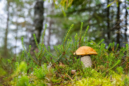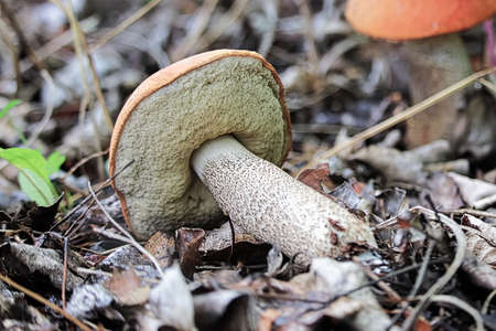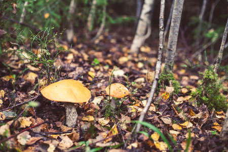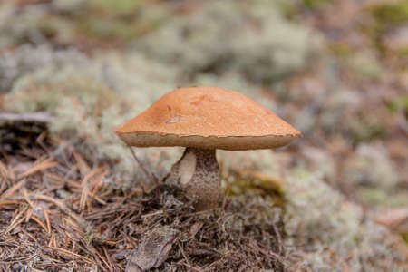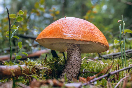 Orange cap boletus mushrooms grows. Fungus mushroom growing in wild wood