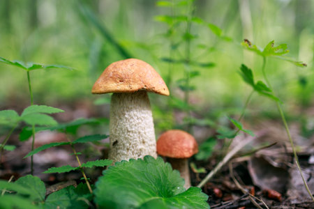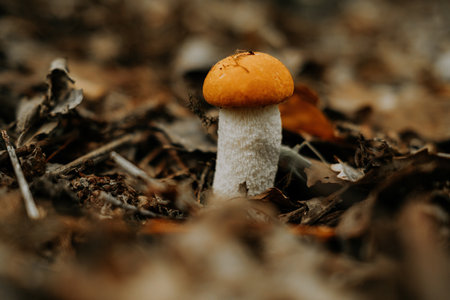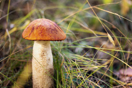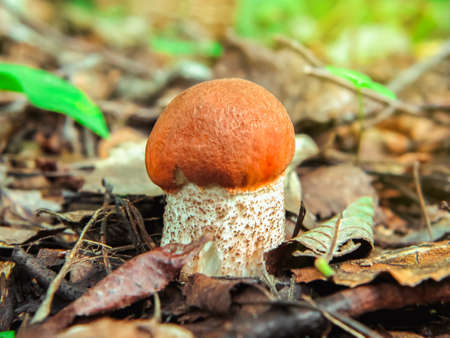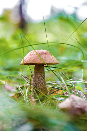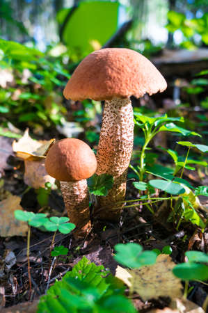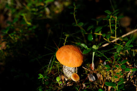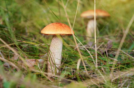 beautiful little mushroom Leccinum known as a Orange birch bolete, growing in a forest at sunrise- image