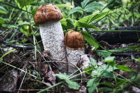 Two boletus edulis mushrooms grow in grass. Orange cap mushrooms in forest