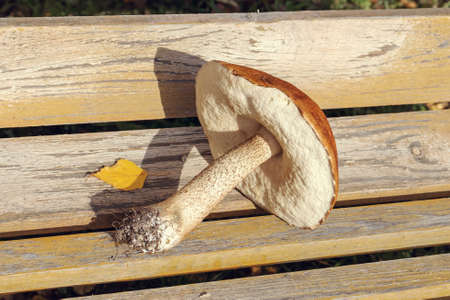 Orange Cap Boletus mushroom on a wooden park bench