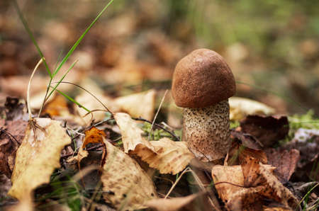 Beautiful edible mushroom with brown cap in autumn grass in sunny woodland. Brown Birch Bolete. Leccinum scabrum mushroom growing in fall woods. Soft Focus