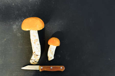 Orange cap boletus Mushrooms in a row on dark background. Nature, environment and edible mushrooms concept with copy space. Top view, flat lay