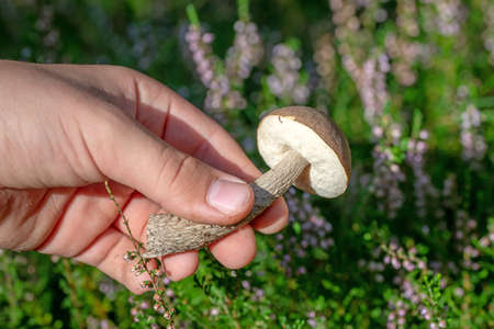 A young birch bolet, Leccinum scabrum mushroom, is held in hand