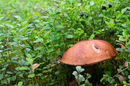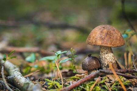 Brown cap boletus close-up growing in wood. Small Leccinum mushroom grow in forest. Beautiful little bolete