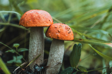Two orange cap boletus mushroom grow Fungus mushroom growing in wild wood