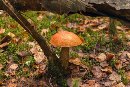 Boletus with an orange cap in the autumn forest among fallen leaves and moss