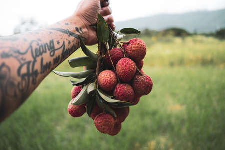 Summer season fresh juicy lychee fruit ready to pluck from tree organic fresh seasonal fruit