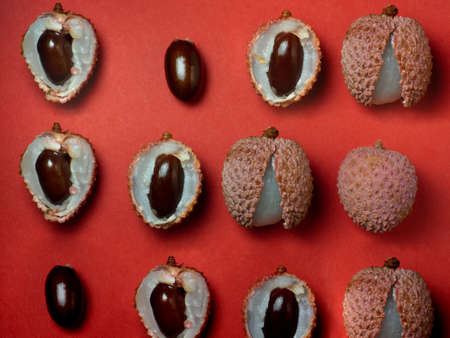 Pattern of cut lychees. Round pimply fruits. Chinese plum. fruit peel. Peeling the lychee. Pieces of juicy fruit on a bright background. Plumpulp.