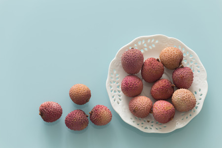 Lychee fruit in white plate on blue background, top view. Many fresh lychees with one opened in the top of pile.
