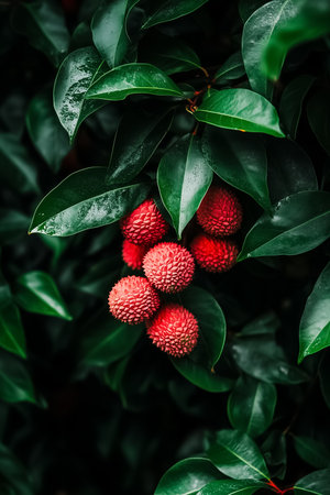 Indulge in the verdant paradise of this vibrant image, where a luscious cluster of lychee fruits hangs from a tree branch, bathed in the warm glow of an evening sun The lush green leaves provide a soft, ethereal backdrop, while bokeh lights dance in the distance, adding a touch of whimsy and enchantment This photograph captures the essence of nature's bounty, inviting us to savor the sweet taste of summer and the beauty of the natural world AI Generative