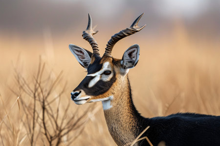 Beautiful Indian gazelle standing in dry grassland with blurred background