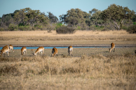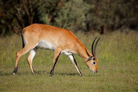 Red Lychee antelope grazes in swampy area near open water. Male Lychee antelope or Kobus leche is an African antelope of the Waterbock genus in the Okavango Delta. Botswana