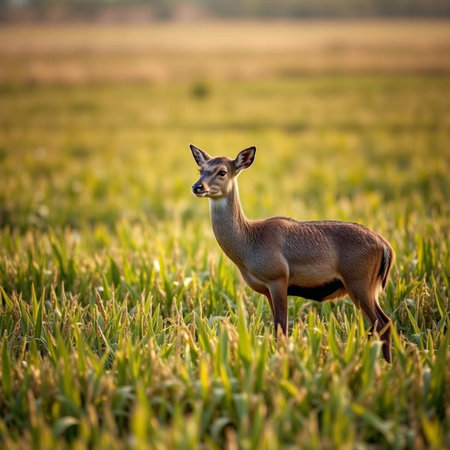 A young deer, possibly a fawn, stands alert in a vast green field with a blurred forest background. The solitary animal looks off to the side, capturing a peaceful moment in nature. The image highlights wildlife in its natural habitat.