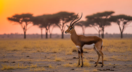 A majestic gazelle stands alert in the African savanna, framed by iconic acacia trees in the background. The warm glow of the sunset paints the sky in shades of orange and pink, highlighting the beauty of the wild environment and its inhabitants.