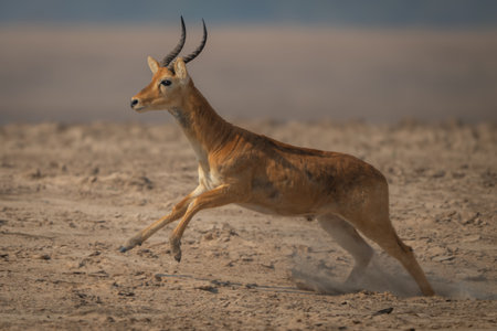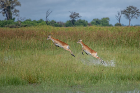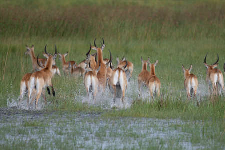 Lechwe, red lechwe, or southern lechwe (Kobus leche) jumping through the water of the Okanvanga floodplains in Mahango National Park in the Carvitrip of Namibia
