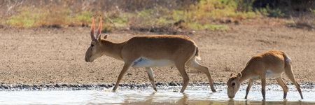 Saiga antelope or Saiga tatarica in steppe. Federal nature reserve Mekletinskii, Kalmykia, Russia.