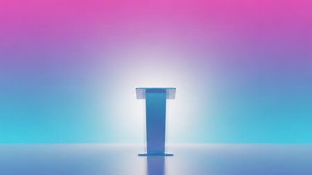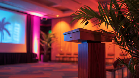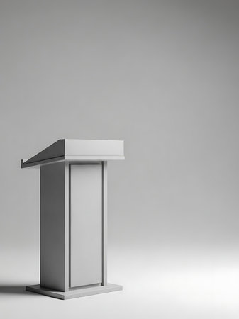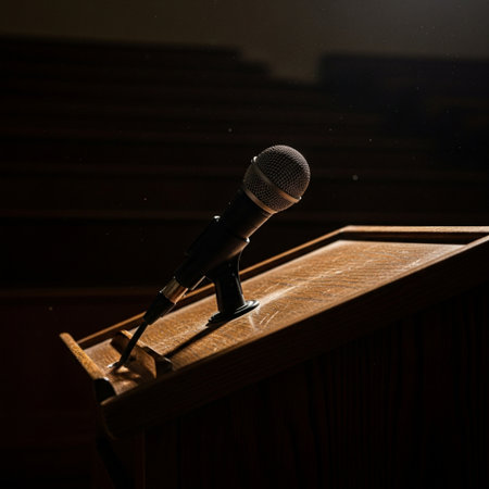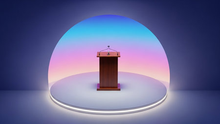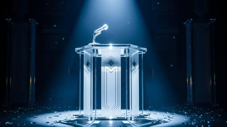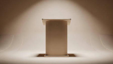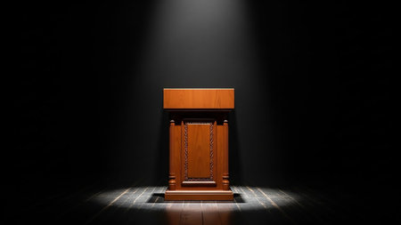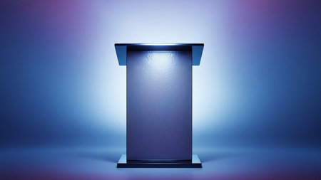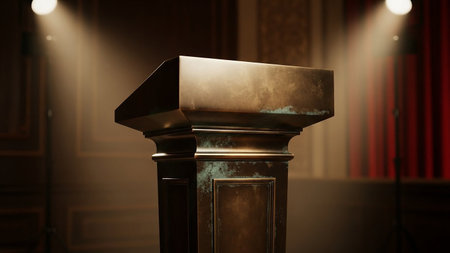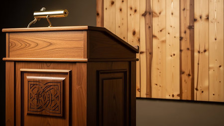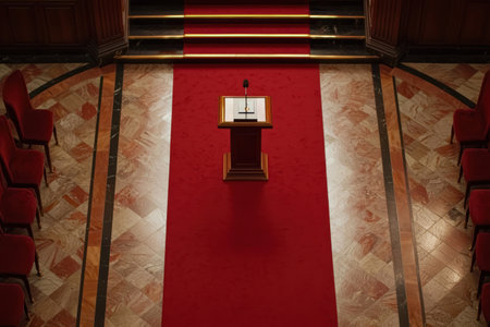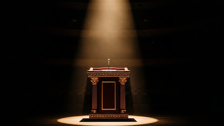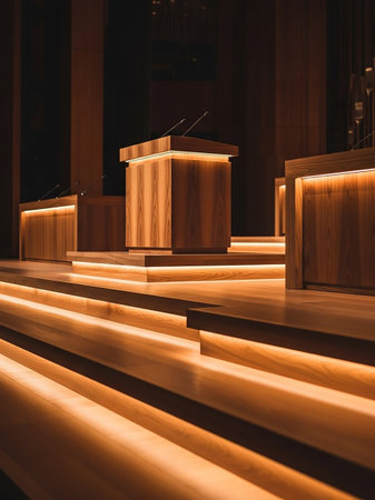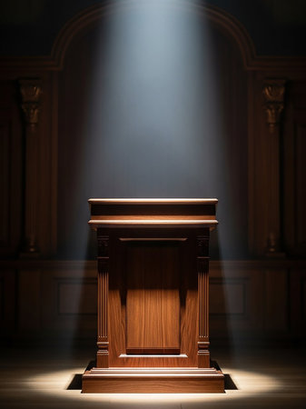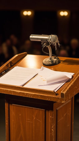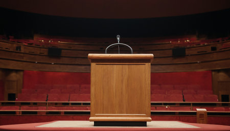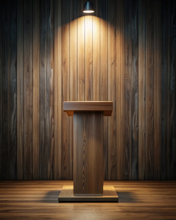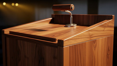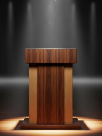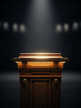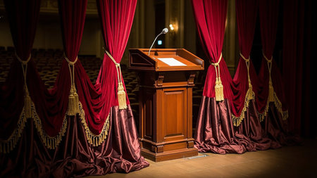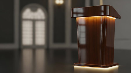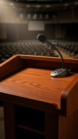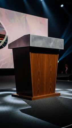 A polished wooden podium with a microphone stands on a stage in an empty auditorium. The podium intricate wood grain and a carved eagle emblem. Soft spotlights illuminate the scene, highlighting...