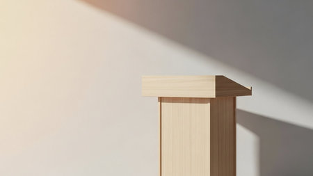 A simple wooden podium stands against a wall, with a diagonal shadow cast by sunlight. Clear details and vibrant colors enhance visual appeal.