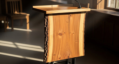 Streaming showing wooden lectern with natural grain texture and sunlight streaming through window. resolution use.