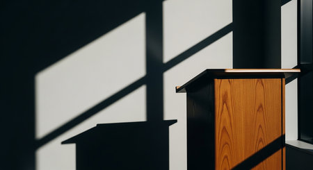 showing wooden lectern with dramatic sunlight and shadow patterns on a textured wall. resolution use.