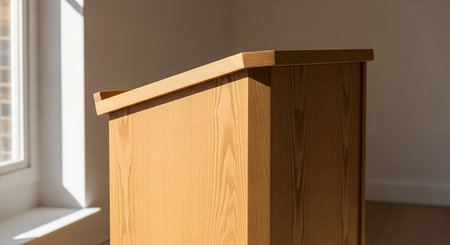 A plain wooden lectern stands centered on a light gray background, illuminated by a spotlight from above.